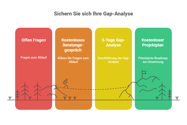 Sichern Sie sich ab. Vereinbaren Sie jetzt Ihr kostenloses 30 Minütiges Beratungsgespräch, um Ihre Fragen zu klären zum Ablauf der 5-Tage Gap-Analyse und erhalten Sie Ihren kostenlosen Projektplan.