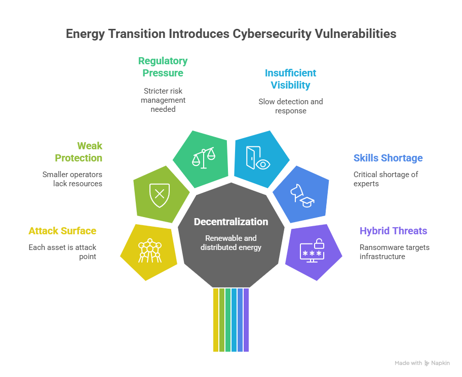 Germany’s energy transition (“Energiewende”) is accelerating the shift to renewable and decentralized energy generation – solar parks, wind farms, and smart grids. While this decentralisation improves sustainability and efficiency, it also introduces new cybersecurity vulnerabilities. Each connected asset – smart meter, substation, or digital control platform – represents a potential attack point. Many systems were not designed for modern cybersecurity, and rapid digitalisation often exceeds security investments.